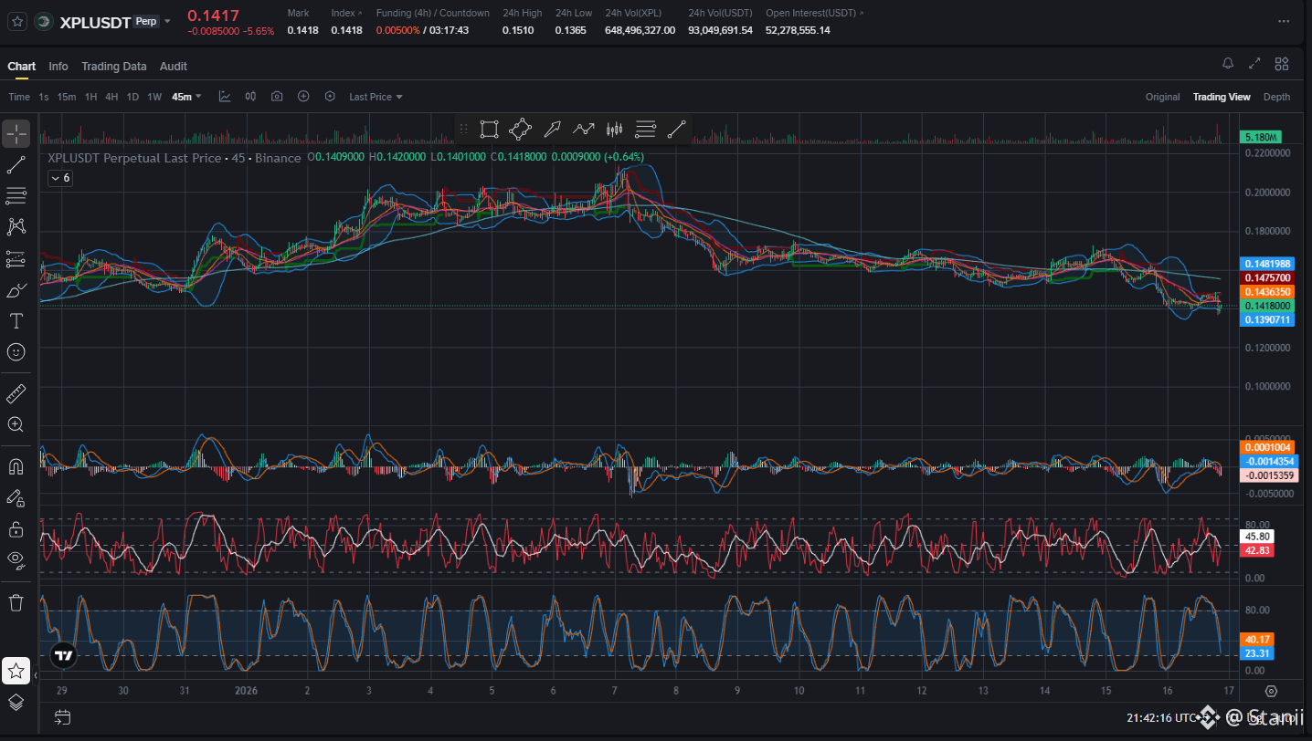Plasma is moving through a phase that only shows its value if you actually watch the tape, not just headlines. On the 45-minute chart, $XPL is currently trading around 0.141–0.142 USDT, after a sharp pullback from the 0.15+ region. Price is sitting below short-term moving averages, volatility has compressed, and momentum indicators are neutral to slightly oversold. This is not euphoria, this is digestion. Over the last 24 hours, XPLUSDT Perp volume is roughly 648M XPL, translating to about 93M USDT, with open interest near 52M USDT. That tells a clear story: participation hasn’t disappeared, leverage is still present, but direction is being decided slowly.