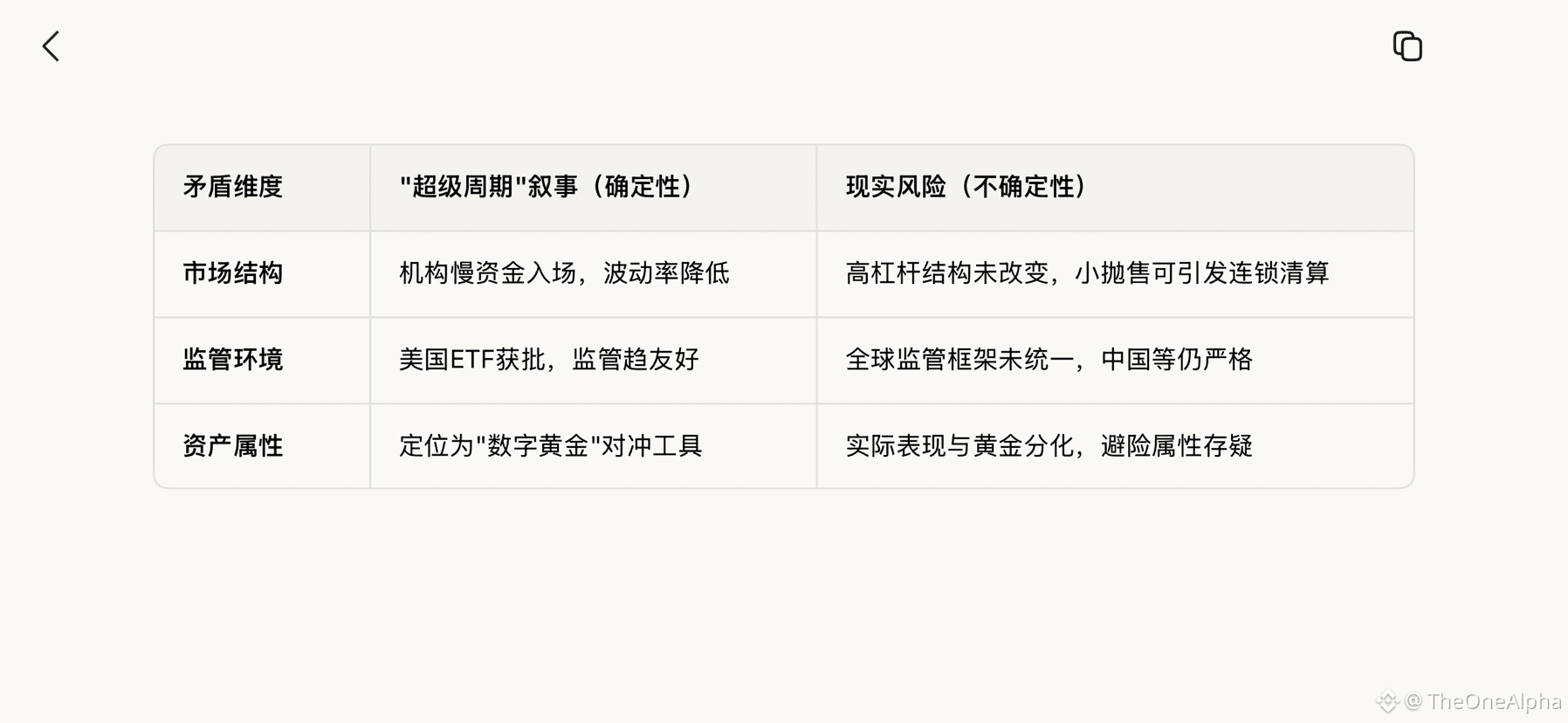 这种矛盾的本质是:用长期趋势(机构化)掩盖短期脆弱性(杠杆、监管、流动性)。CZ试图将"超级周期"描述为一种确定性趋势,但实际市场仍处于过渡期,新旧特征并存,风险并未消失。