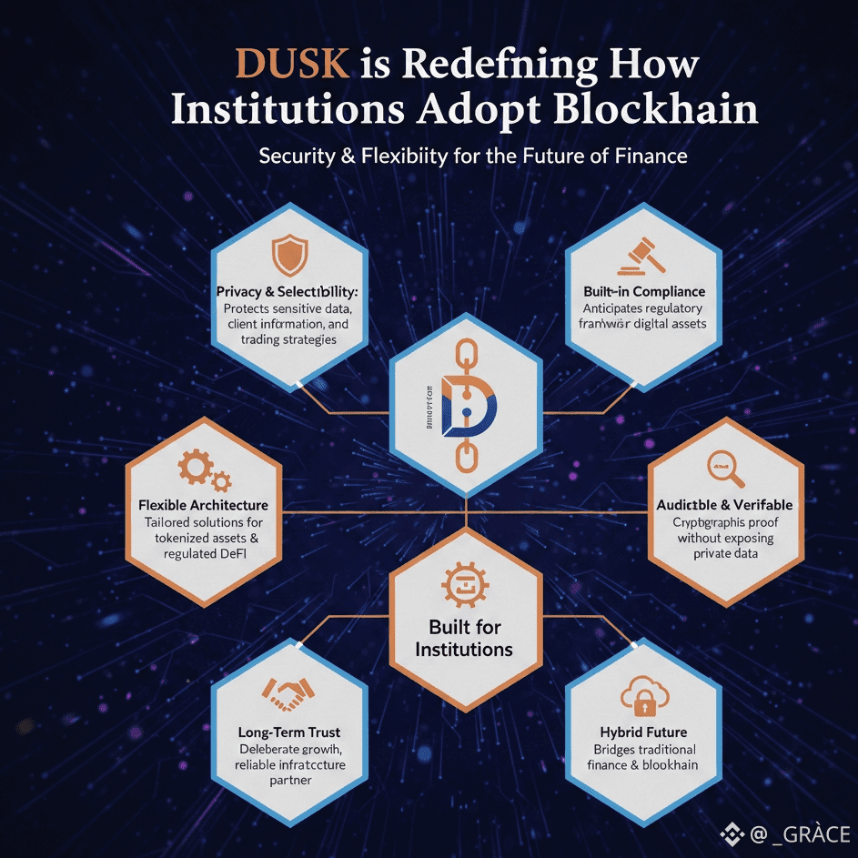 From day one, Dusk was designed with institutions in mind. Privacy, transparency where it counts, and flexibility are not afterthoughts they are built into the network. This means organizations can explore blockchain without risking sensitive information or running afoul of regulations. Instead of asking institutions to change how they operate, Dusk adapts to them.