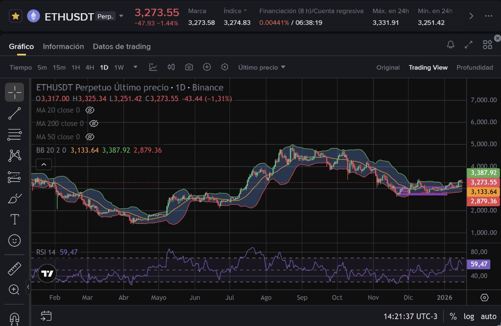 Obecnie rynek przeszedł z fazy ekspansji (euforii) do fazy kompresji i korekty. Świeczki dzienne pokazują, że chociaż byki próbowały przejąć kontrolę, podaż w górnej części była większa, co doprowadziło do powrotu ceny do średniej strefy handlowej (~3.270 USDT). To nie jest załamanie, to rynek "oddycha" po wysiłku.