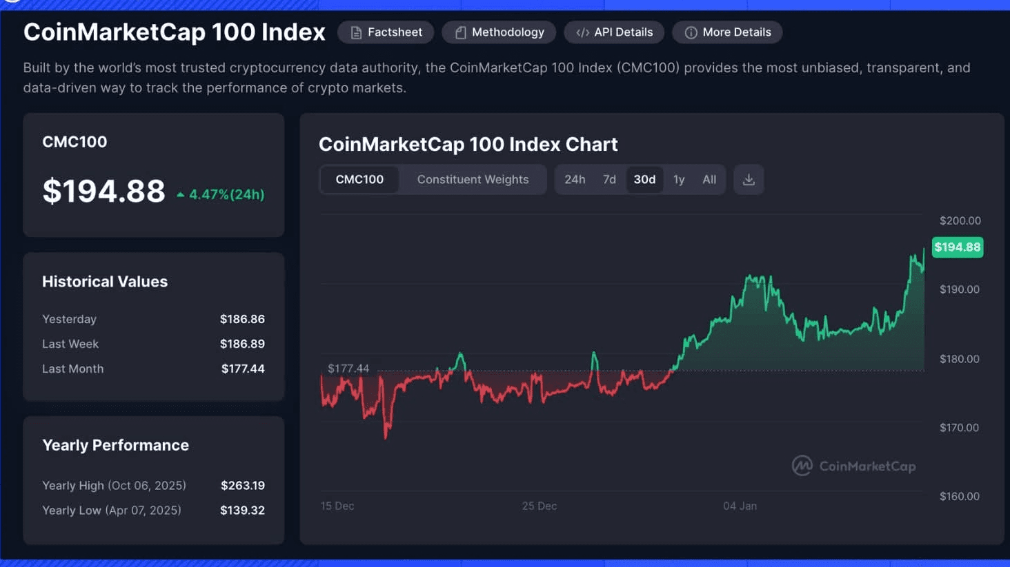 Kiedy Indeks CMC 100 rośnie, oznacza to, że kupujący są aktywni na całym rynku — nie tylko w jednej lub dwóch monetach. Dlatego ruch o +4.47% w 24h jest ważny. Pokazuje szeroką siłę, a nie przypadkowy wzrost.