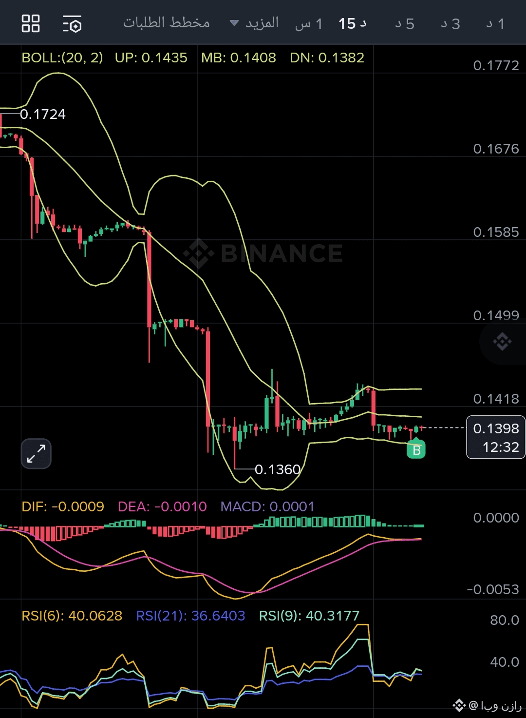 بعد الهبوط الحاد (Dump)، السعر يستقر حالياً فوق المتوسطات المتحركة القصيرة، هناك محاولة للارتداد (Bounce) لكن السعر لا يزال تحت المتوسط المتحرك MA(99).