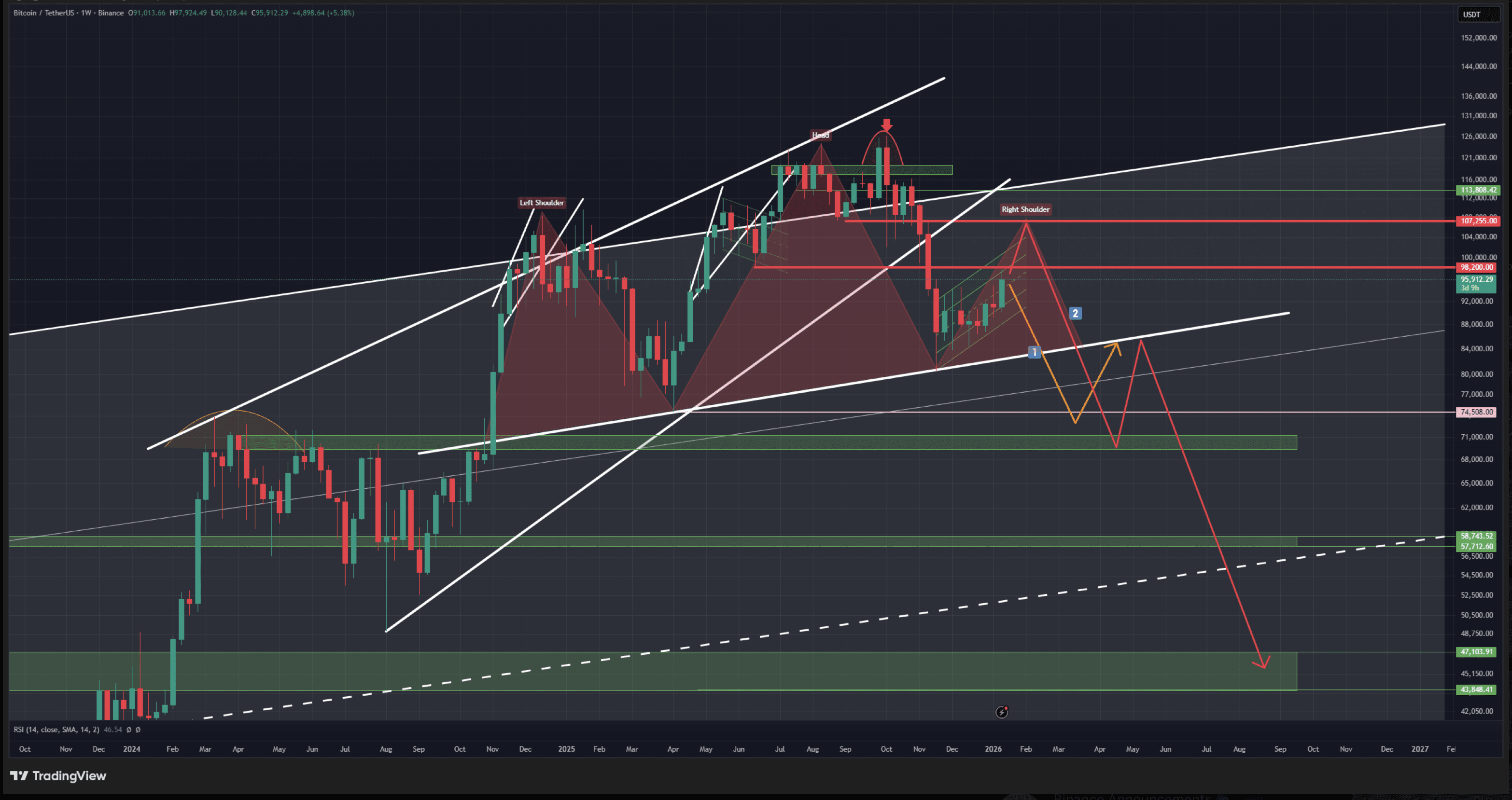 następnie brutalny trend spadkowy, który ledwo zatrzymuje się na $74K przed kontynuacją w dół.