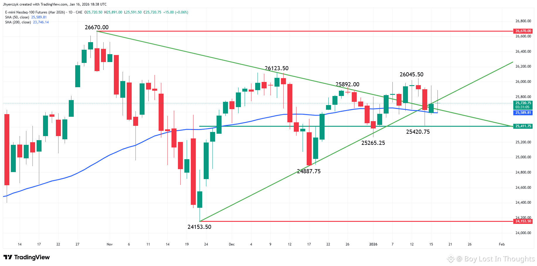Nasdaq-100 futures are balanced near key technical levels—watch the 50-day moving average for direction into the close.