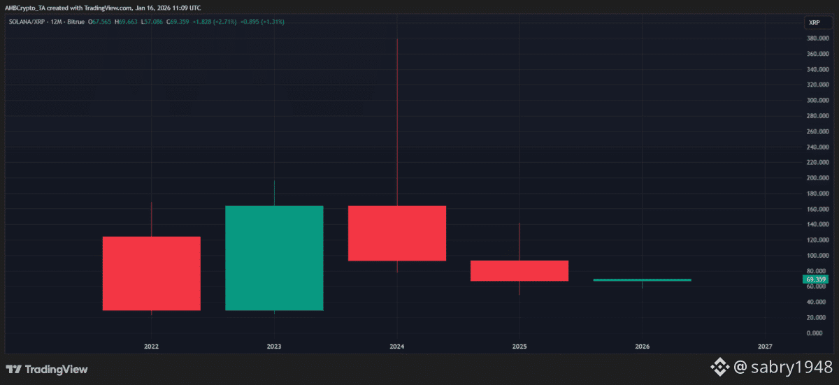 في الواقع، حتى الآن في عام 2026، يستمر Ripple [XRP] في التخلف عن Solana [SOL]. ومع ذلك، عند النظر إلى الصورة الأوسع، يظهر مشهد مختلف – دورة XRP في عام 2025 حددت الخسائر بنسبة 12% فقط، مقارنة بـ 35% لـ SOL.