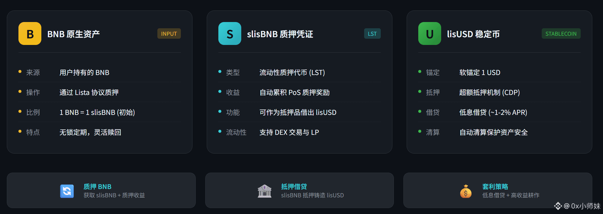 例如,在牛市初期,投资者可以通过抵押 slisBNB 借出 lisUSD,并将其投入到收益率更高的流动性挖矿或代币激励池中。