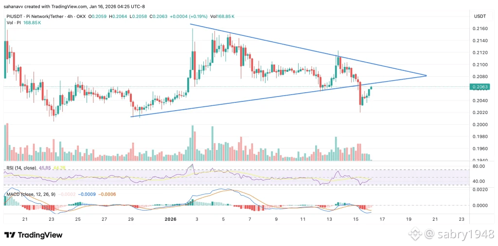 يتداول سعر PI حاليًا قرب 0.206 دولار، محاولًا الاستقرار بعد ارتفاع حاد أعقب كسرًا فنيًا واضحًا. على الرسم البياني لأربع ساعات، كان سعر شبكة Pi Network يتذبذب ضمن مثلث متماثل، يتكون من قمم أدنى وقيعان أعلى. يشير هذا النمط عادةً إلى انضغاط قبل حركة سعرية أكبر. في حالة PI، انهار النموذج هبوطًا قرب قمته، دافعًا السعر نحو منطقة 0.20-0.202 دولار قبل أن يتدخل المشترون بارتداد.
