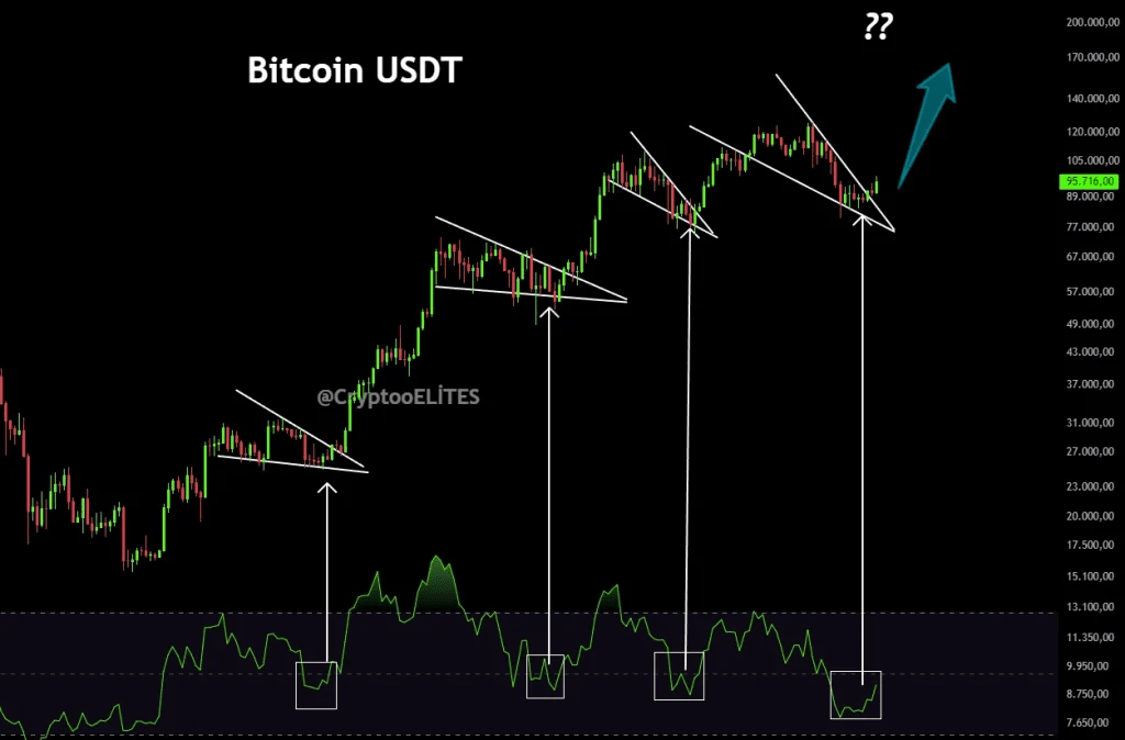 W związku z tym, para Bitcoin/dolar amerykański jest bliska wyjścia z logarytmicznego trendu spadkowego, co powinno zapoczątkować jej rakietowy wzrost w krótkim okresie. Ponadto, cena Bitcoina przekroczyła krytyczny poziom podaży w okolicach 94,4 tysiąca dolarów.