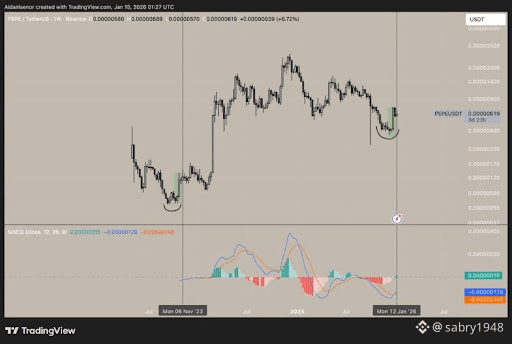 أشار المحلل إلى أن PEPE قد سجّل للتو تقاطع MACD صعودي على الإطار الزمني الأسبوعي. يظهر الرسم البياني خطوط MACD الأسبوعية تتقاطع صعودًا، مع تحول الزخم من اللون الأحمر (هابط) إلى الأخضر (صاعد). يأتي هذا التحرك بعد اتجاه هبوطي طويل، ويتزامن مع استقرار السعر وبدء ارتفاع تدريجي، وهو نمط غالبًا ما يرتبط بتشكيل قاع مستدير (rounded bottom).