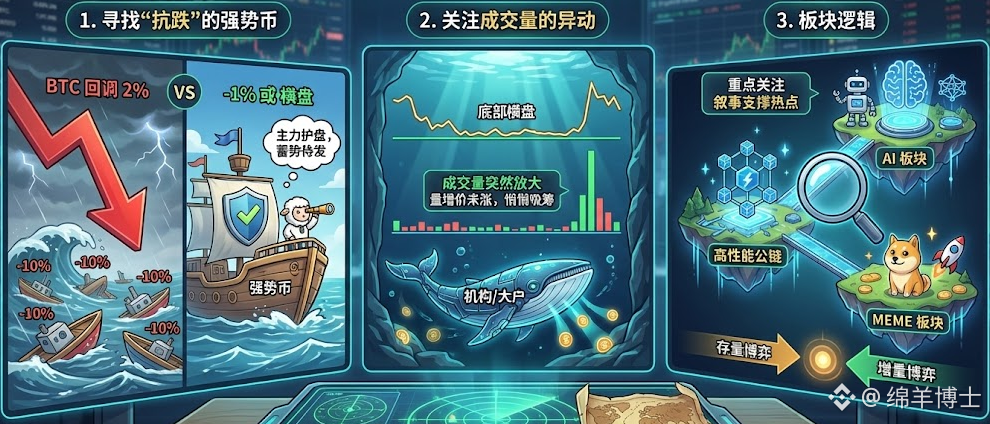 观察大盘回撤时的表现。比如BTC回调了2个点,大部分山寨跌了10个点,但某个币只跌了1个点甚至还在横盘。这种币就是典型的有主力护盘的强势币。它在蓄势,一旦大盘企稳,它通常是第一个冲出去的。