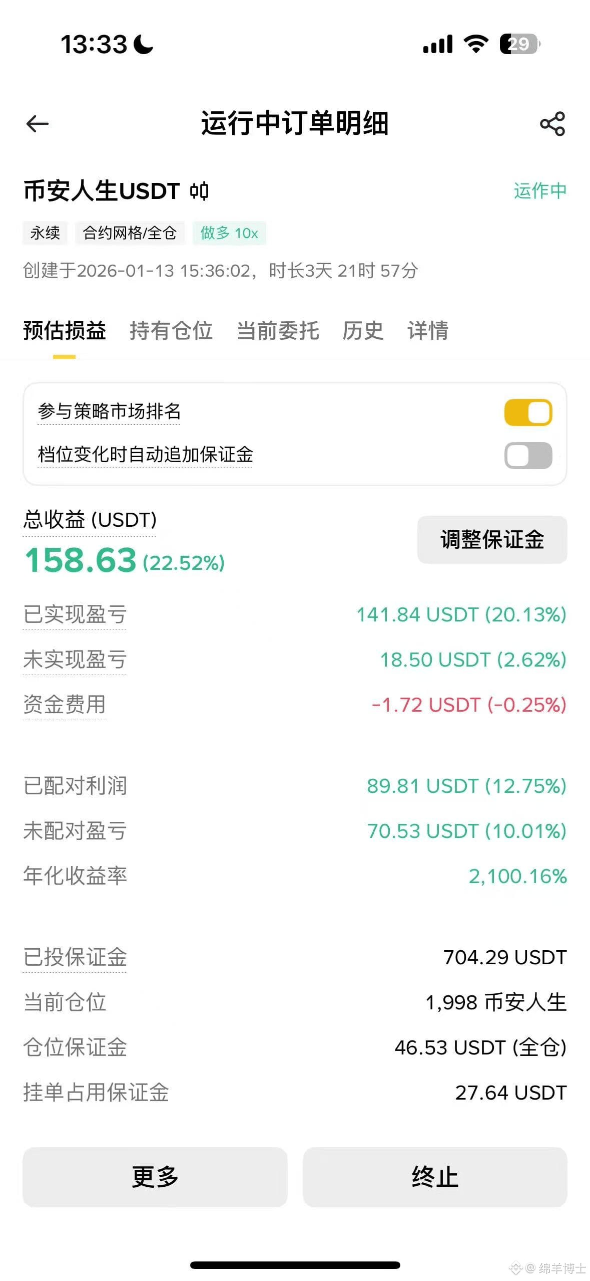 在山寨季来临前,庄家最常用的手段就是“反复摩擦”。比如这一次的$币安人生,所以我在这里开了一个合约网格