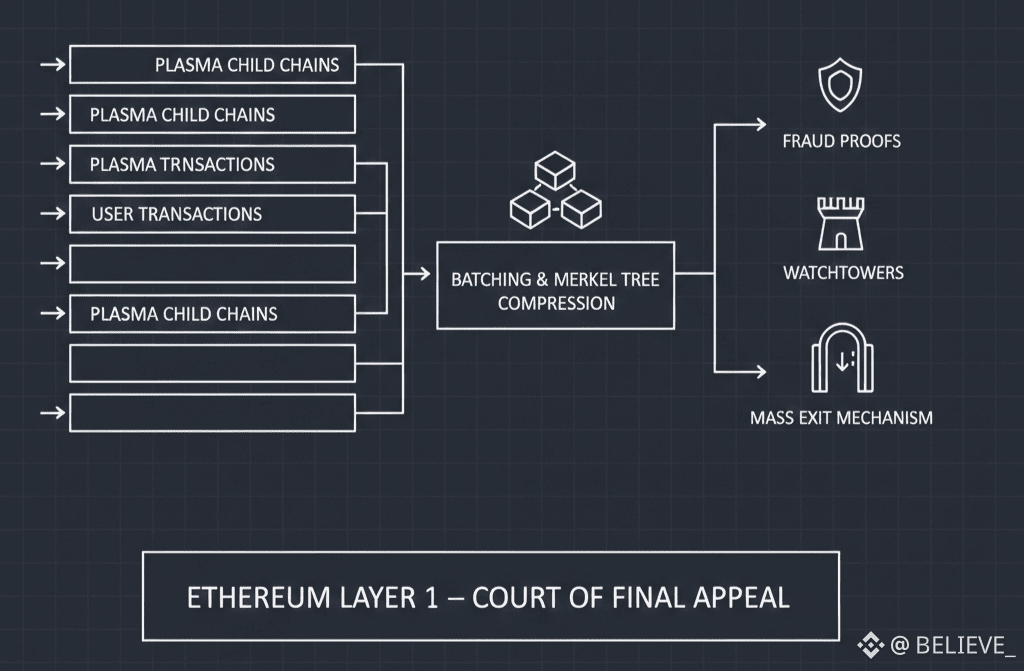 At its core, Plasma answers a question Ethereum has wrestled with for years: how to scale without fragility. Instead of bloating the base layer, Plasma distributes computation across specialized child chains, each optimized for distinct economic behavior. Ethereum becomes the court of final appeal, not the execution bottleneck. This architectural humility—doing less on Layer 1 but doing it perfectly—has become Plasma’s defining strength.