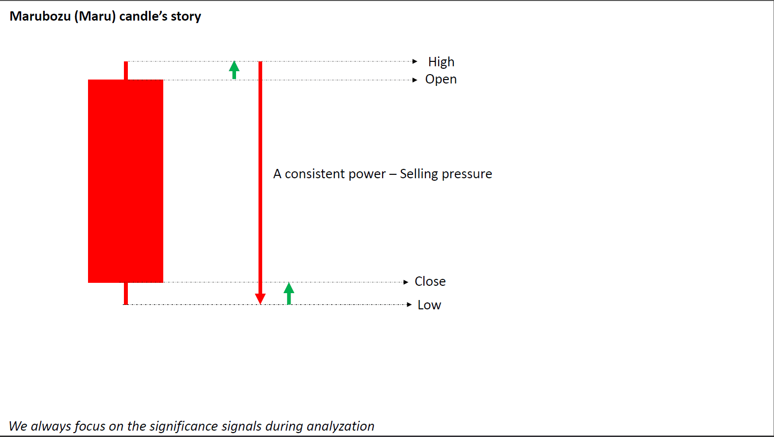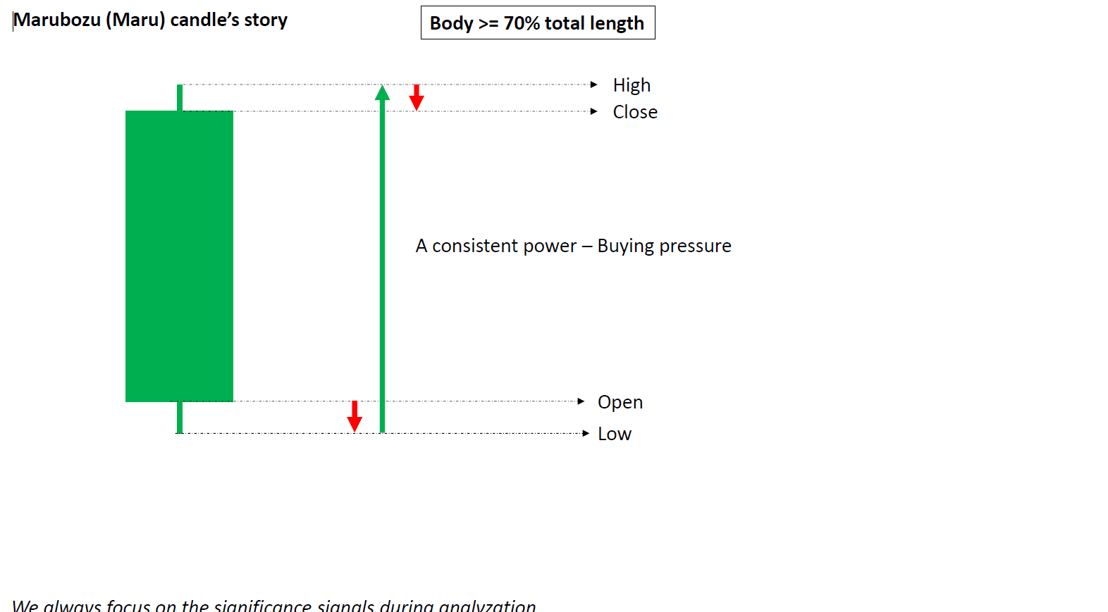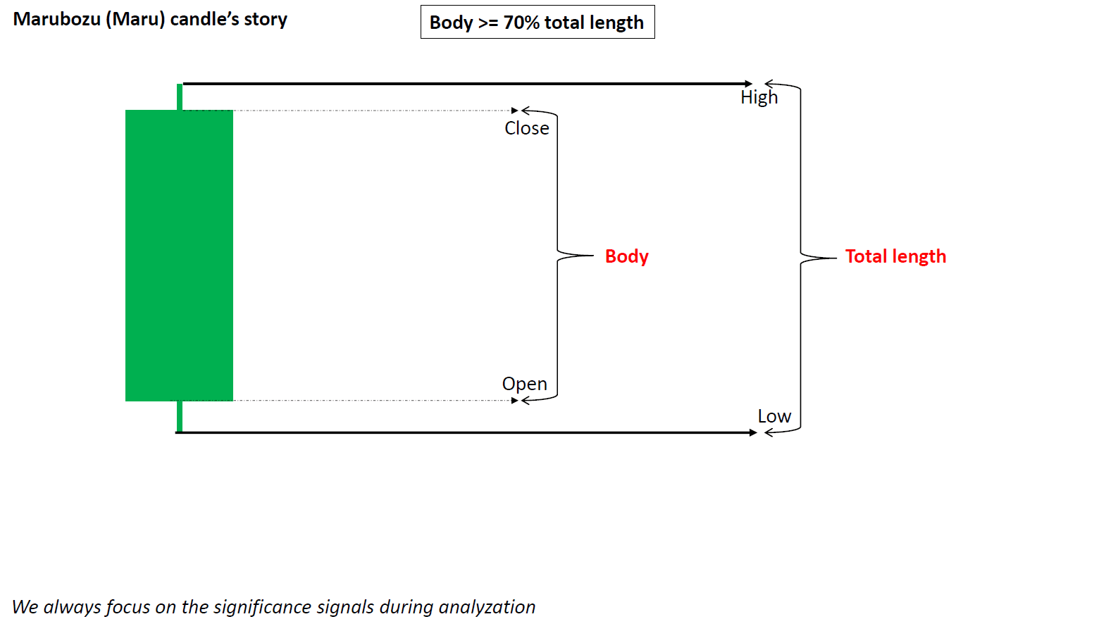 Maru candle pokazuje silną presję na rynku, co oznacza siłę kupujących lub sprzedających w zależności od koloru. Pojawienie się tej świecy na rynku mówi nam tylko, że istnieje część pomiędzy kupującymi a sprzedającymi, która kontroluje rynek; masz charakterystyki tej świecy na obrazku.