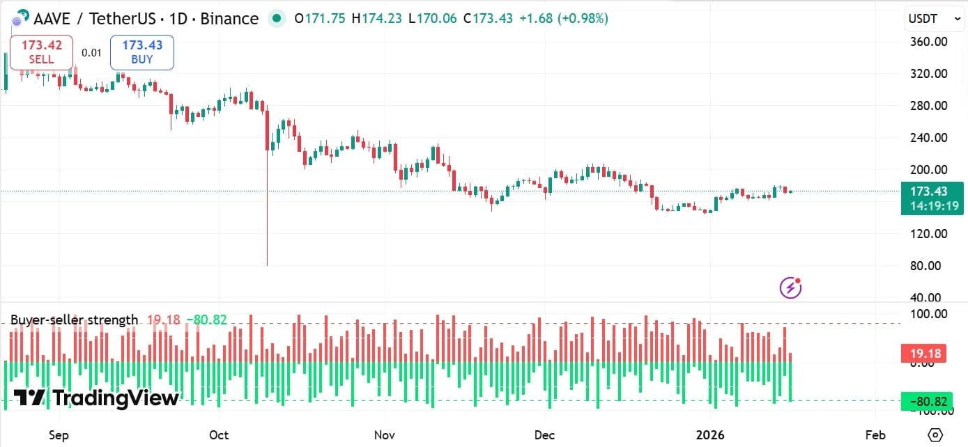 Z drugiej strony, jeśli niedźwiedzie ponownie przejmą kontrolę nad rynkiem, cena może ponownie spadać, szukając wsparcia w okolicach 168 dolarów. To zdeterminuje, czy AAVE wejdzie w nową fazę wzrostu, czy też będzie kontynuować wahania w obrębie zakresu.