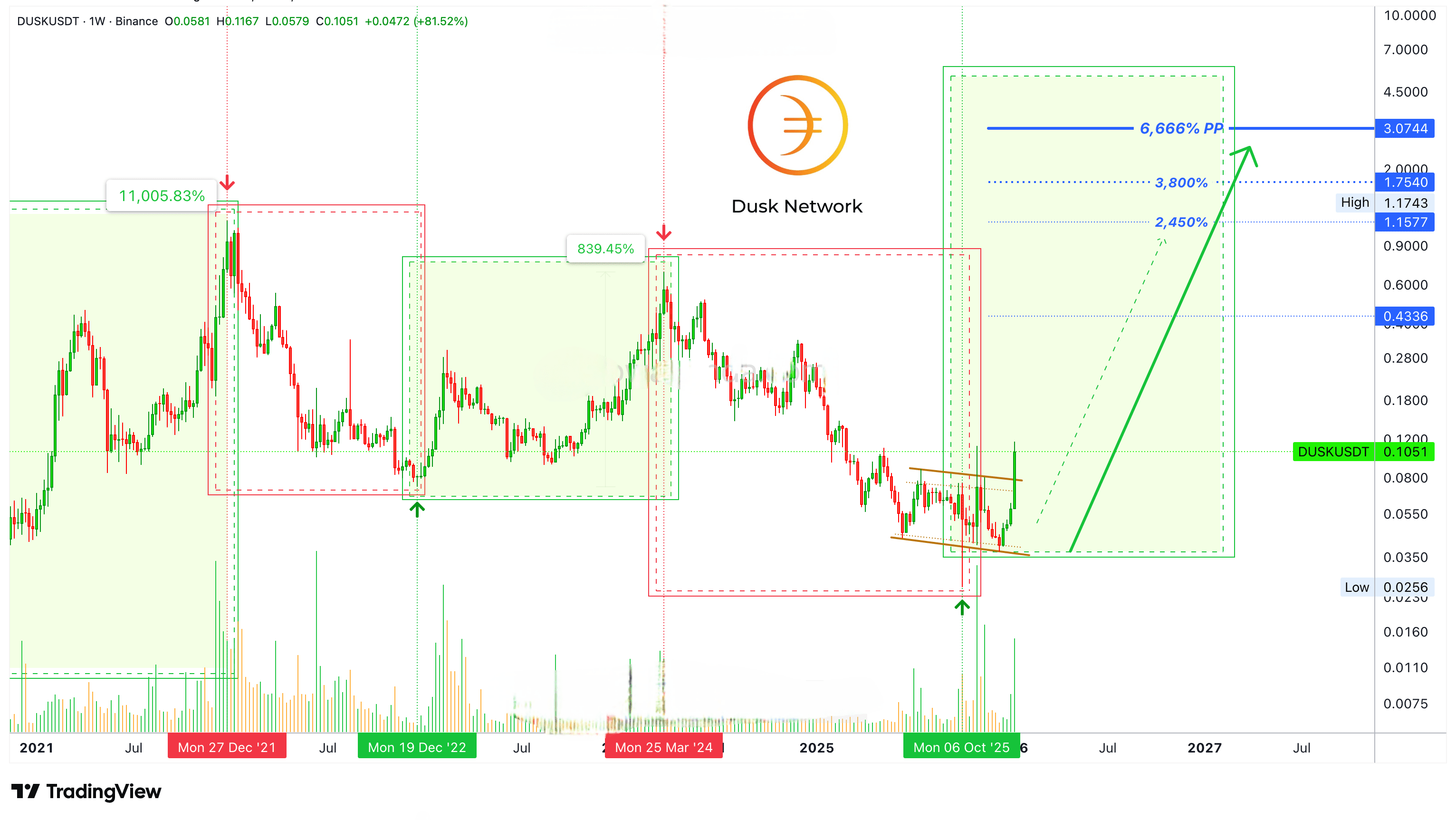 Śledzimy DUSK od momentu wyprzedaży w październiku, a ten projekt wyróżnia się silnym ruchem w listopadzie. Ten ruch wygenerował najwyższy wolumen od 2022 roku, co dla nas sygnalizuje początek nowego byczego cyklu.