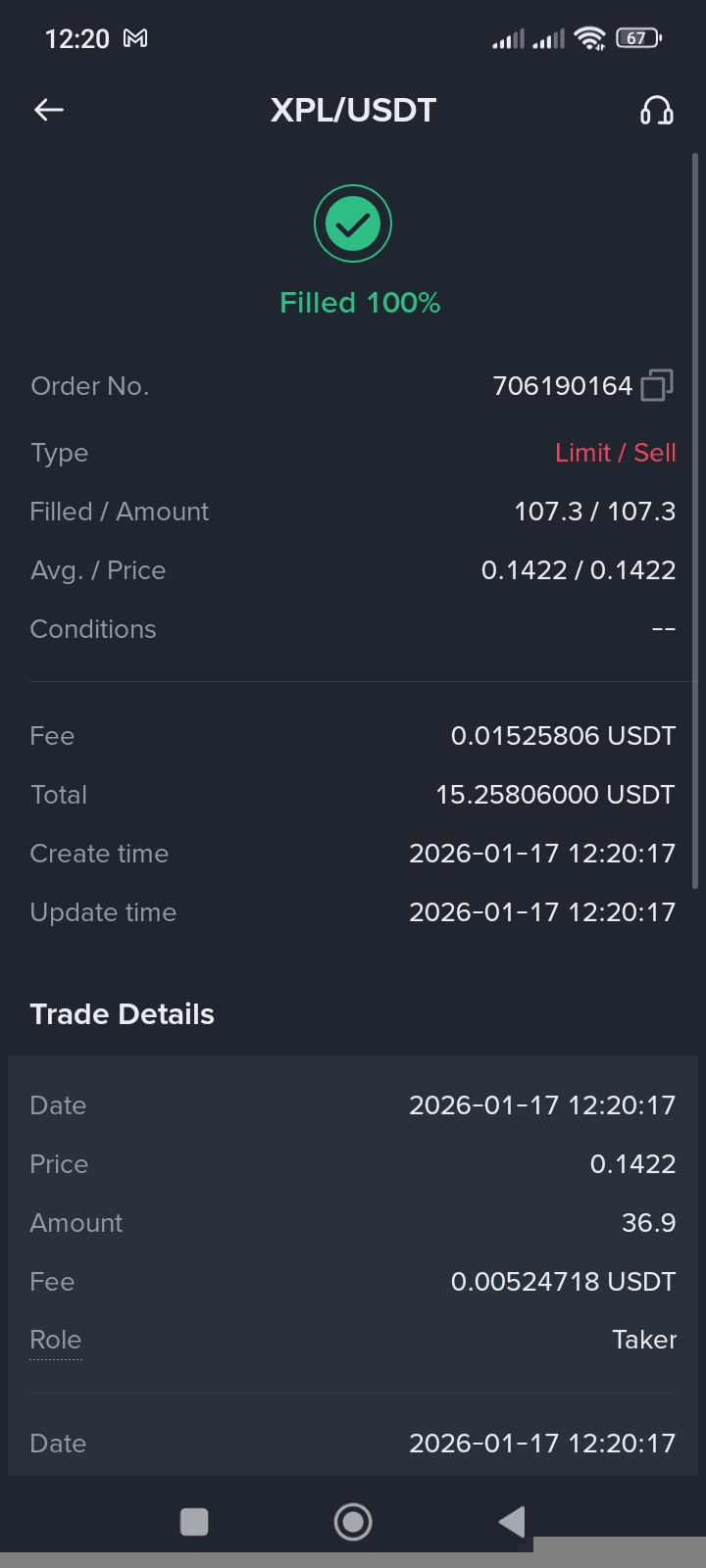 W moim ostatnim handlu złożyłem zlecenie sprzedaży limitowanej na 107.3 XPL, które zostało w 100% zrealizowane po średniej cenie 0.1422 USDT. Całkowita wartość transakcji wyniosła 15.25806 USDT, z opłatą handlową w wysokości 0.01525806 USDT. Zlecenie zostało zrealizowane płynnie, bez opóźnień, a część transakcji została zrealizowana jako kupujący, co pokazuje zdrową aktywność rynkową i dopasowywanie zleceń.