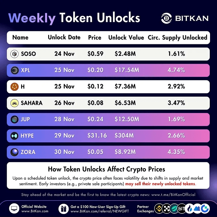 Największe odblokowanie wartości w tym tygodniu należy do HYPE. 29 listopada HYPE odblokuje około 304 milionów dolarów wartości tokenów. To równa się 2,66 procenta jego krążącej podaży. Udział podaży jest mniejszy niż XPL lub ZORA. Mimo to, wysoka wartość w dolarach czyni to bardzo ważnym. Duże odblokowania mogą wpływać na nastroje rynkowe i krótkoterminowy przepływ.