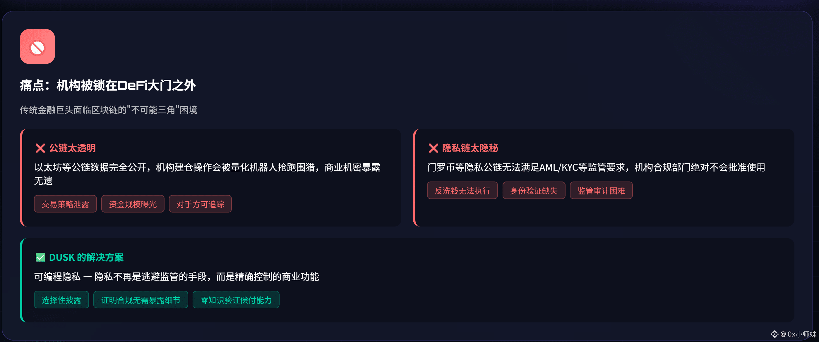 这就形成了一个看似无解的死结:公链太透明不合规,隐私链太隐秘不合规。这个死结锁死了万亿级真实世界资产上链的通道。