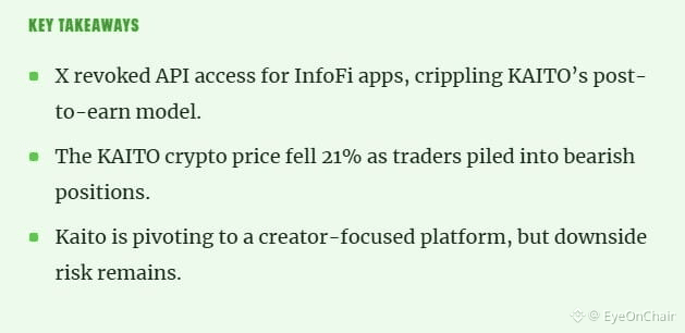 Yesterday was a wake-up call for a lot of people. X pulled the plug on API access for InfoFi apps, and just like that, $KAITO ’s whole “post-to-earn” engine stalled. Price tanked. Models broke. Creators who built on that system were left staring at a blank screen wondering, now what?
