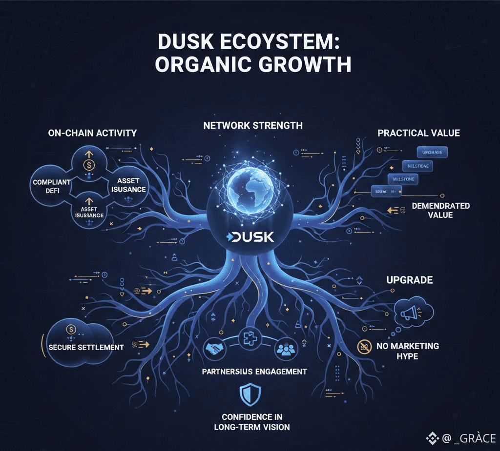 The ecosystem is growing organically. On-chain activity is increasing as projects explore compliant DeFi, asset issuance, and secure settlement solutions. Partnerships, collaborations, and community engagement strengthen the network, reinforcing confidence in Dusk’s long-term vision. Every upgrade and milestone demonstrates practical value, not marketing hype.