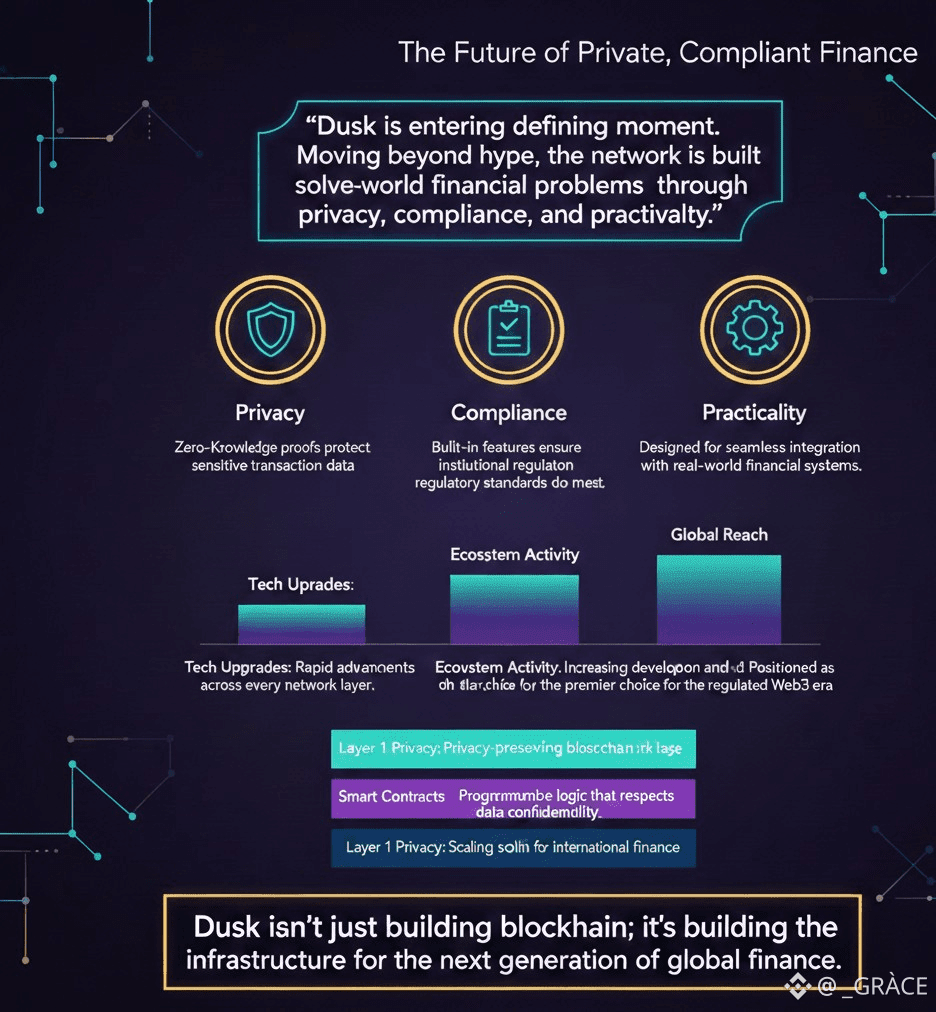 Dusk is entering a defining moment. The team is moving fast, steadily advancing the network across every layer. Unlike projects chasing hype, Dusk has always focused on building blockchain solutions that solve real financial problems combining privacy, compliance, and practicality. Recent tech upgrades, ecosystem activity, and institutional interest suggest the network is ready for the regulated Web3 era.