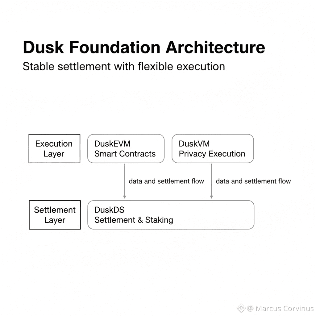 The architecture of Dusk separates the core settlement layer from the execution layer. This is a quiet but powerful design choice. The settlement layer stays stable and dependable. Applications can evolve on top of it without breaking the foundation. Developers are able to build using tools they already understand. They’re not forced into unfamiliar systems just to participate. If builders feel comfortable, ecosystems grow naturally instead of being forced.