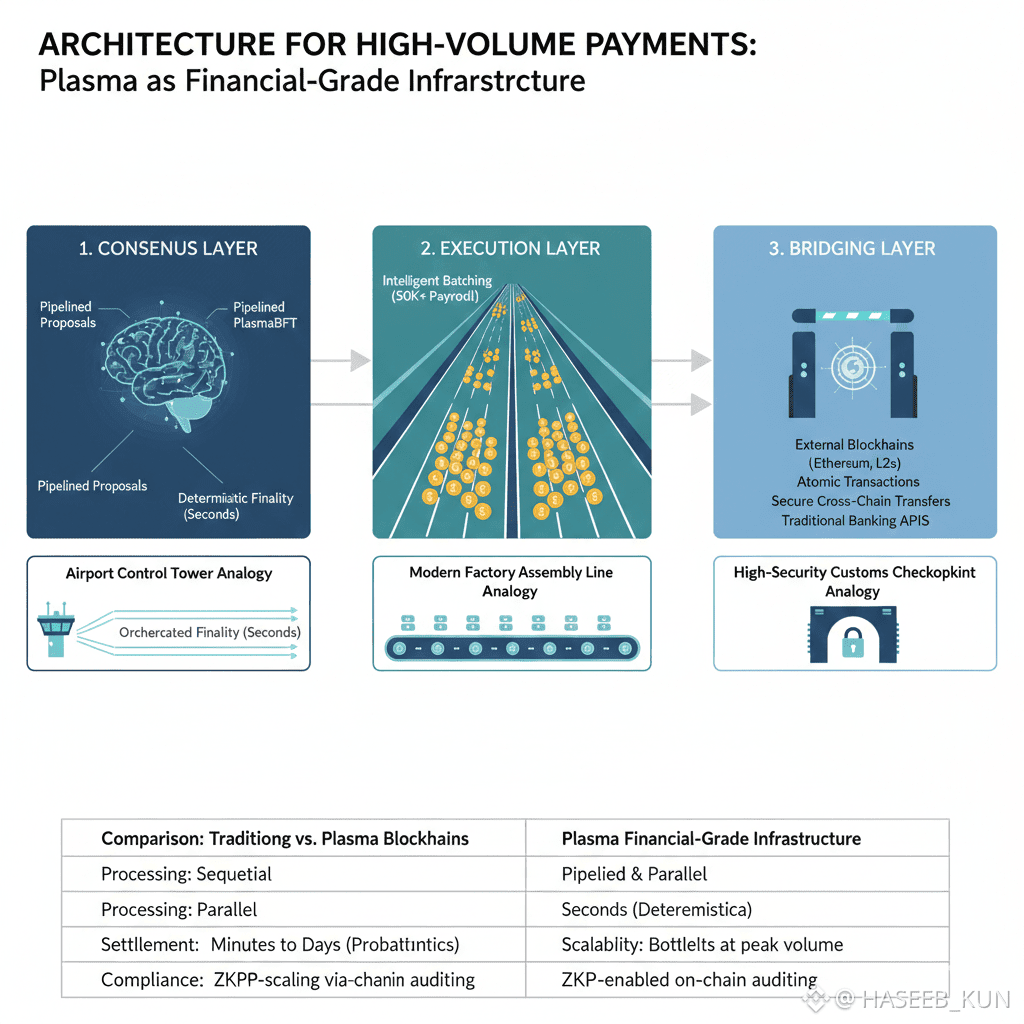 Plasma’s design is inherently modular, dividing the network into three interconnected layers: consensus, execution, and bridging. Each layer performs a distinct function, yet all operate in harmony to support enterprise-grade high-volume transactions.