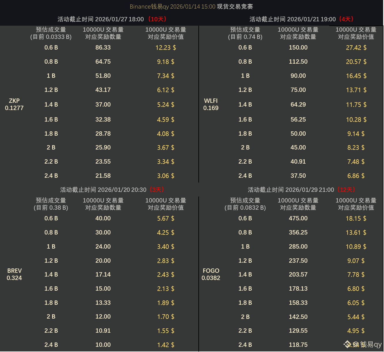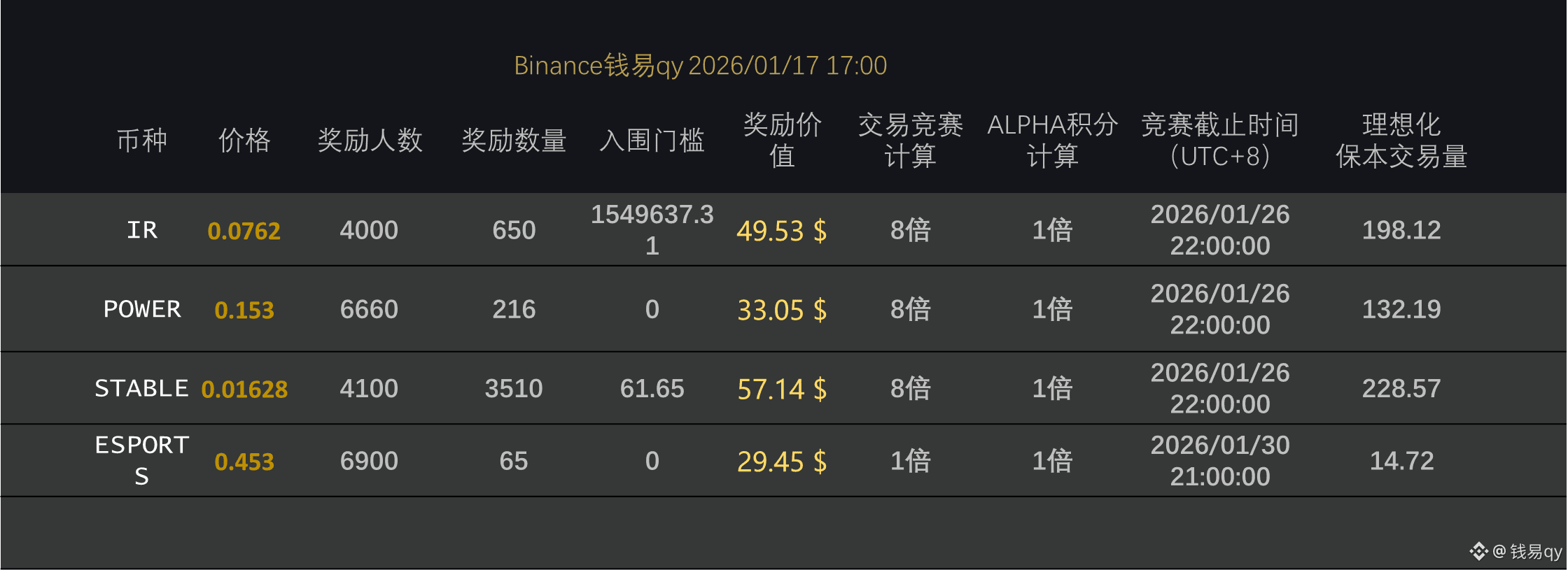 目前这几个都是 1 倍积分币,目前交易量活跃的有 IR、STABLE,IR 的话估计要反撸了,4 倍消失了这个币门槛还在不断增加。