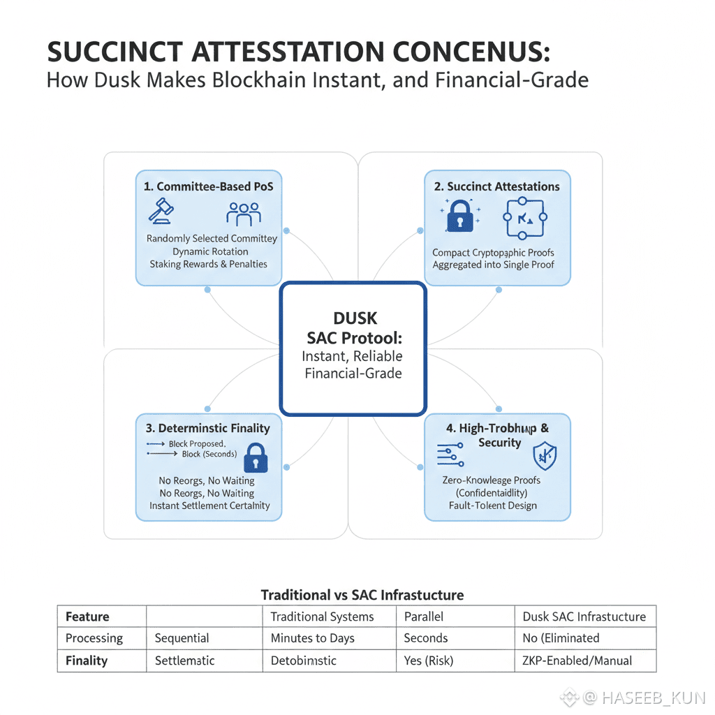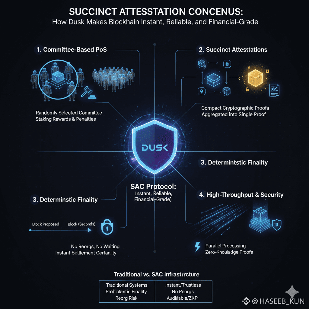 In conclusion, Dusk’s Succinct Attestation Consensus Protocol is more than a technical innovation—it’s a blueprint for fast, secure, and auditable financial-grade blockchain. By combining committee-based PoS, succinct attestations, and deterministic finality, SAC delivers instant settlement, minimizes reorgs, and supports high-throughput operations. It turns blockchain from a speculative technology into a reliable, predictable infrastructure that behaves like modern banking: fast, secure, and trustworthy. For anyone building, trading, or transacting in digital finance, Dusk’s SAC protocol is setting the standard for how blockchain should operate in the real world.