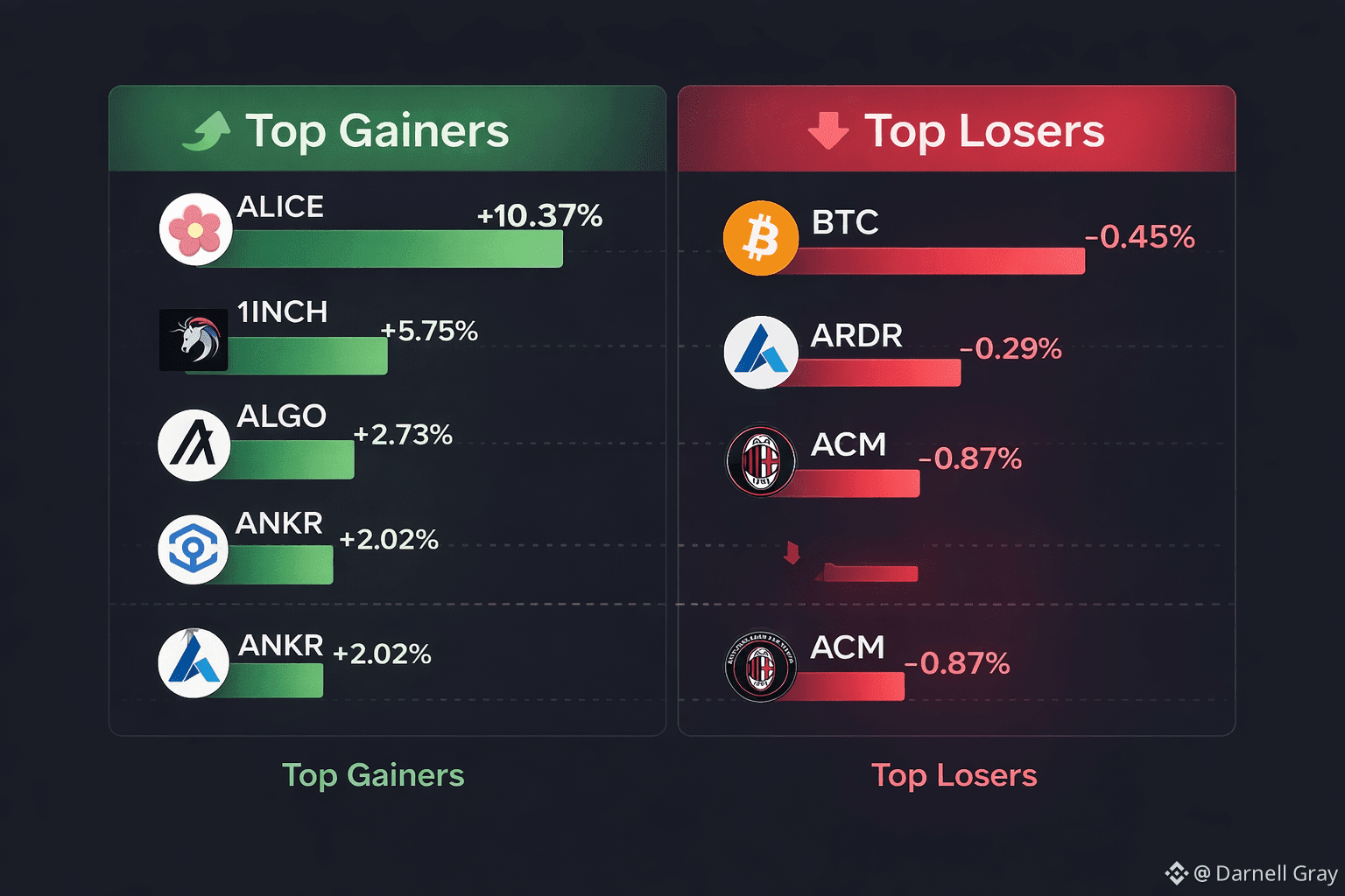 This Binance market chart shows mixed perf$XRP ormance across major cryptocurrencies. ALICE is the top gainer with a strong rise of +10.37%, indicating high buying interest and short-term momentum. 1INCH, ALGO, ANKR, and AAVE also show positive gains, suggesting strength among selected altcoins. On the downside, Bitcoin (BTC) records a slight loss of −0.45%, reflecting minor market correction. ACM and ARDR# are also in the red, showing weak demand compared to gainers. Overall, the chart highlights stronger movement in altcoins while large-cap coins remain relatively stable. #ACM #MarketRebound #BTC100kNext?