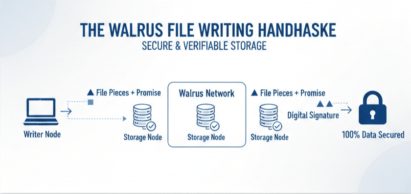 Kiedy chcę zapisać coś w Walrus, dochodzi do bardzo specyficznego uścisku dłoni między pisarzem a węzłami przechowującymi. Pisarz wysyła kawałki pliku wraz z obietnicą, że dane są poprawne i przestrzegają zasad siatki.