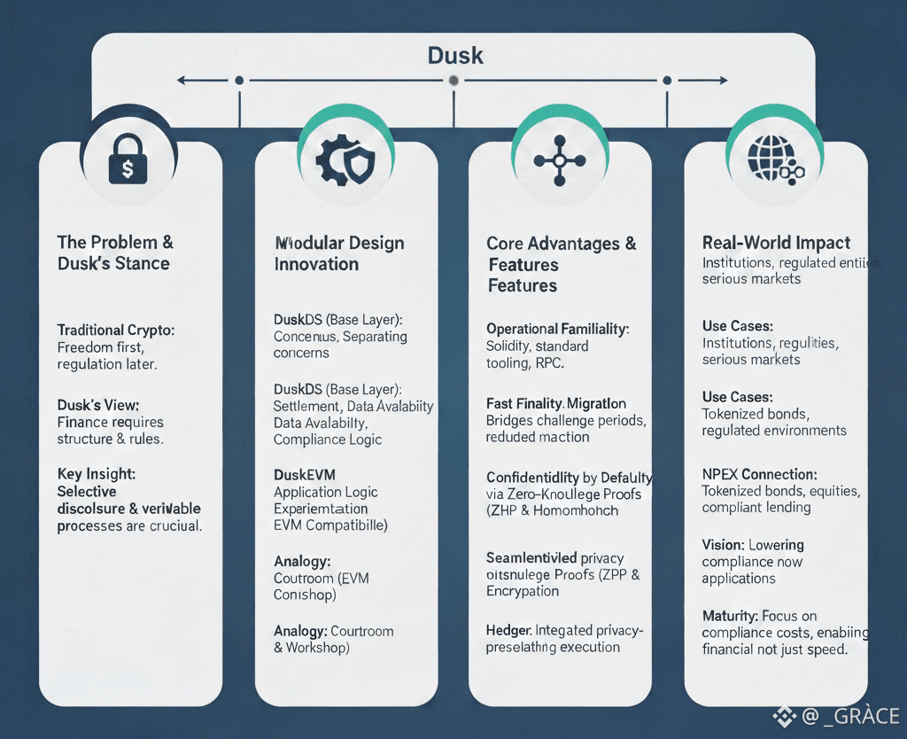 Dusk feels different because it never pretended that finance could exist without structure. From the beginning, the project took a position that many crypto teams avoided: if you want to support capital markets, you don’t get to ignore the rules. You also don’t get to expose everything just because transparency is philosophically appealing. Finance runs on selective disclosure, controlled access, and verifiable processes. That reality doesn’t disappear just because execution happens on-chain.