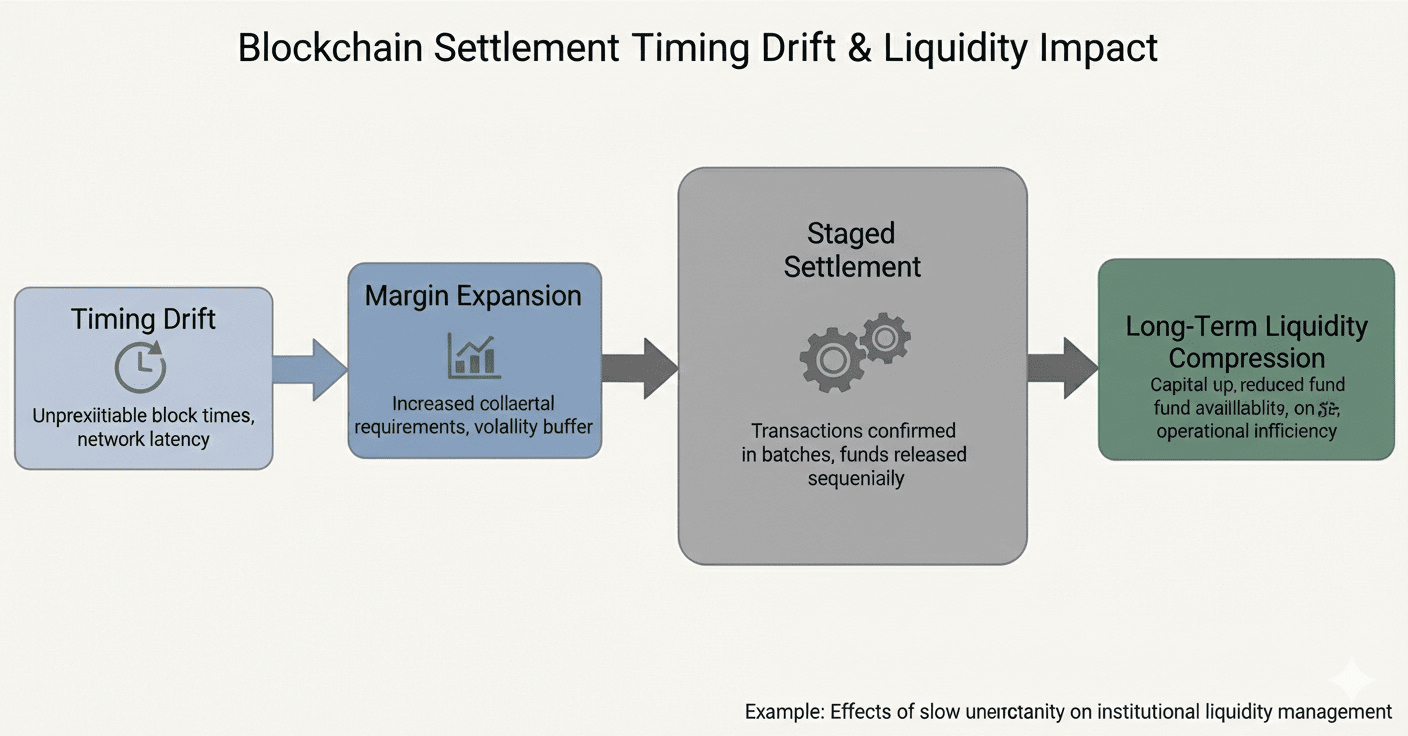 Na Dusk, efektywność kapitałowa nie łamie się głośno. Erozuje, gdy dryf czasowy zmusza założenia marży do rozszerzenia – nie przez dekret polityczny, ale przez matematykę. Kilka dodatkowych punktów bazowych buforu tutaj. Nieco wyższe wymagania prefundacji tam. Nagle ten sam bilans rozlicza mniej transakcji niż w zeszłym tygodniu.