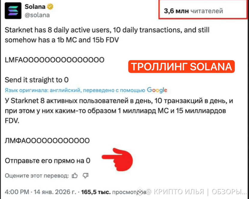 ➡️Официальный Twitter $SOL публично высмеял StarkNet, указывая на: 8 активных пользователей в день и 10 ежедневных транзакций в сети, что совсем не соответствует оценке проекта…