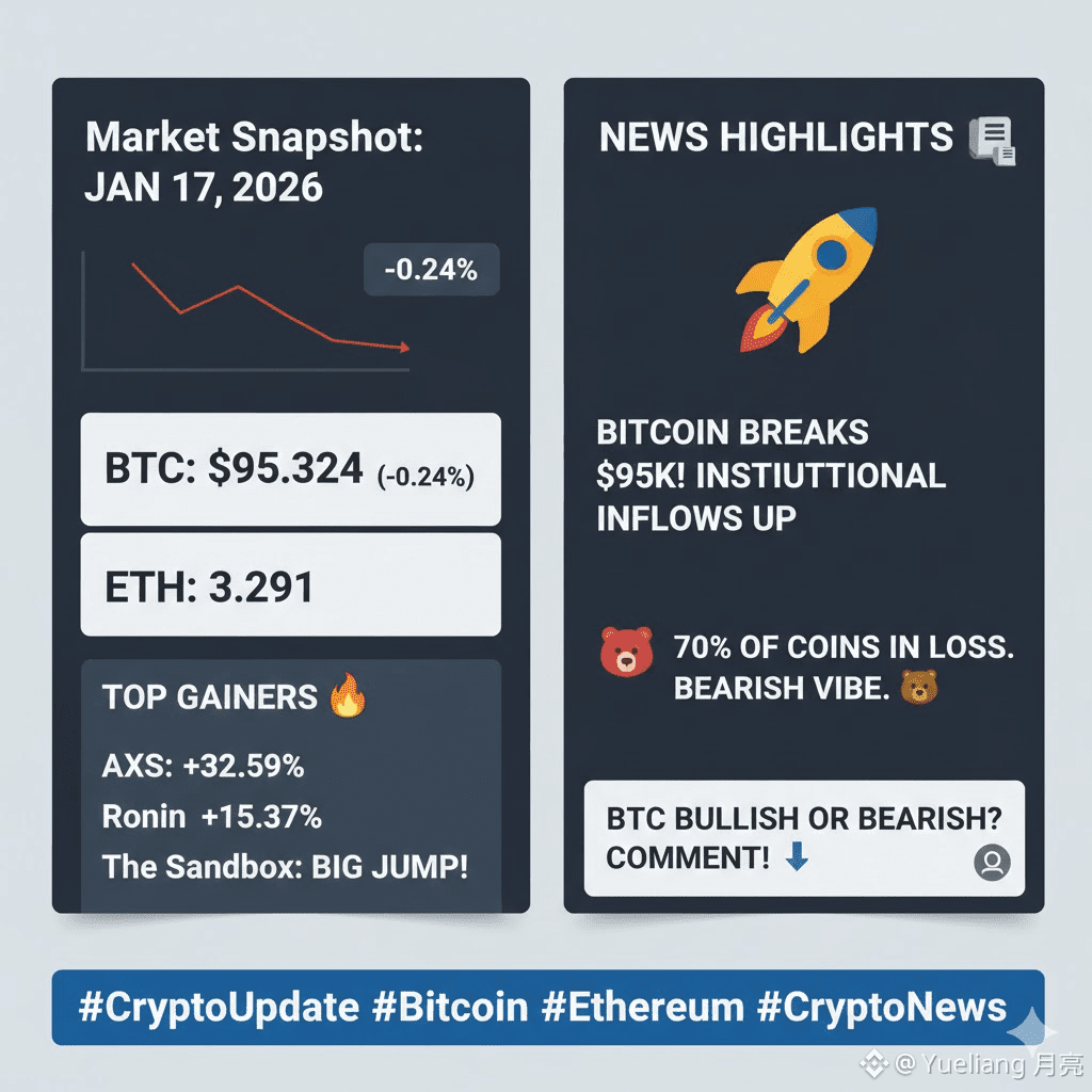 January 17, 2026: Market stable but down slightly (-0.24%). BTC holds at $95,324, ETH $3,291.