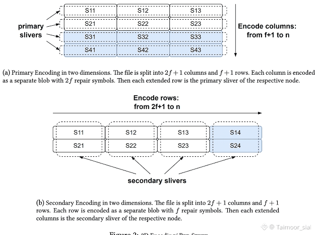 However, Walrus does not assume that this initial distribution is sufficient forever. Some honest nodes may miss their primary sliver entirely during the write phase. In many storage systems, this would lead to permanent imbalance or force a costly global rebuild. Walrus avoids this outcome by introducing a second encoding dimension. After primary encoding, the system performs secondary encoding across rows instead of columns. Each row is encoded as its own blob and extended horizontally, producing secondary slivers that are distributed across nodes.
