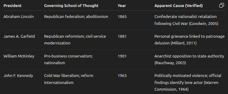 This study demonstrates that U.S. presidential assassinations have historically arisen from specific ideological and personal conditions rather than random occurrence. While contemporary political polarization mirrors some historical stressors, institutional safeguards and security capacities are substantially stronger today. Evaluating leadership stability through risk-factor analysis rather than prediction provides a more ethical and methodologically sound framework. Ultimately, democratic resilience depends not only on leadership but on the strength of institutions and civic norms.