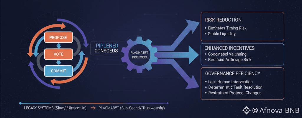 The pipelined structure of PlasmaBFT sounds straightforward, yet its impact is often underestimated. Proposal, voting, and commitment phases overlap instead of occurring sequentially, stripping idle time out of consensus itself. Nothing waits its turn. This is not about forcing blocks through faster; it is about refusing to leave capital immobilized while machines politely alternate. In calmer markets, these pauses go unnoticed. Under volatility, they expand into measurable losses.