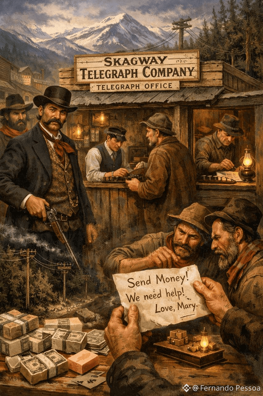 Але його шедевром на Аляці став телеграфний офіс. Уявіть ситуацію: ви проїхали пів світу, виснажені, налякані дикою природою, і хочете повідомити рідним, що доїхали живими. Ви бачите вивіску «Телеграфна компанія Скагвея». Все виглядає солідно: дроти, апарати Морзе, ділові оператори.
