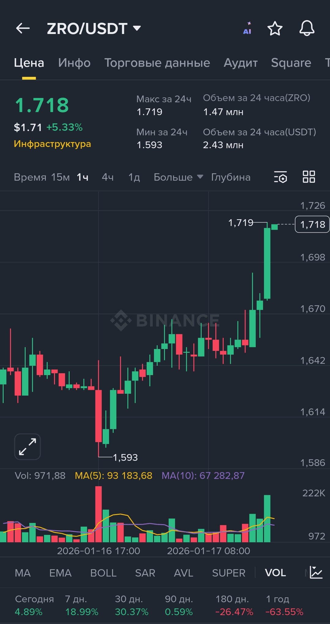 Cena ZRO/USDT waha się w okolicach ~1.6💲(dane z ostatnich dni).