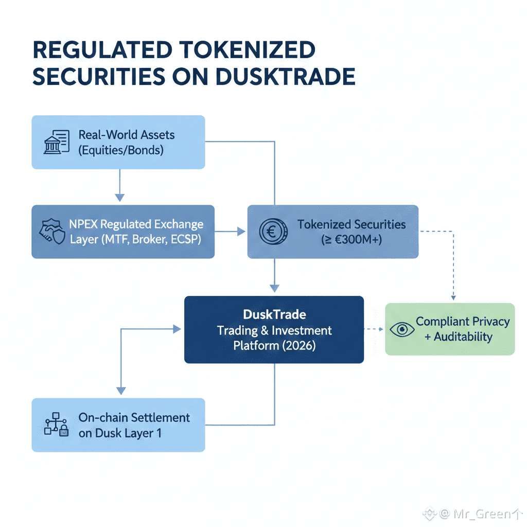DuskTrade is set to go live in 2026, and it’s being presented as Dusk’s first major use case: a compliant trading and investment platform, working with NPEX, a regulated market from the Netherlands. The headline detail isn’t the mere fact of “tokenized assets”; it’s how they fit into a framework. NPEX has MTF, Broker and ECSP licenses, and aims to onboard €300M+ tokenized securities on-chain. That’s not a demo. That’s not a vibe. That is a serious effort to make blockchain into market infrastructure that real institutions can use.