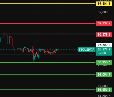 Zwróć uwagę na poziom 95800 dla BTC w nocy, jeśli utrzyma się powyżej tego poziomu, to ta 4-godzinna korekta się kończy i rynek znów wzrośnie. Zwróć uwagę na poziomy oporu 96880-98000-99800 w pobliżu tych wartości!