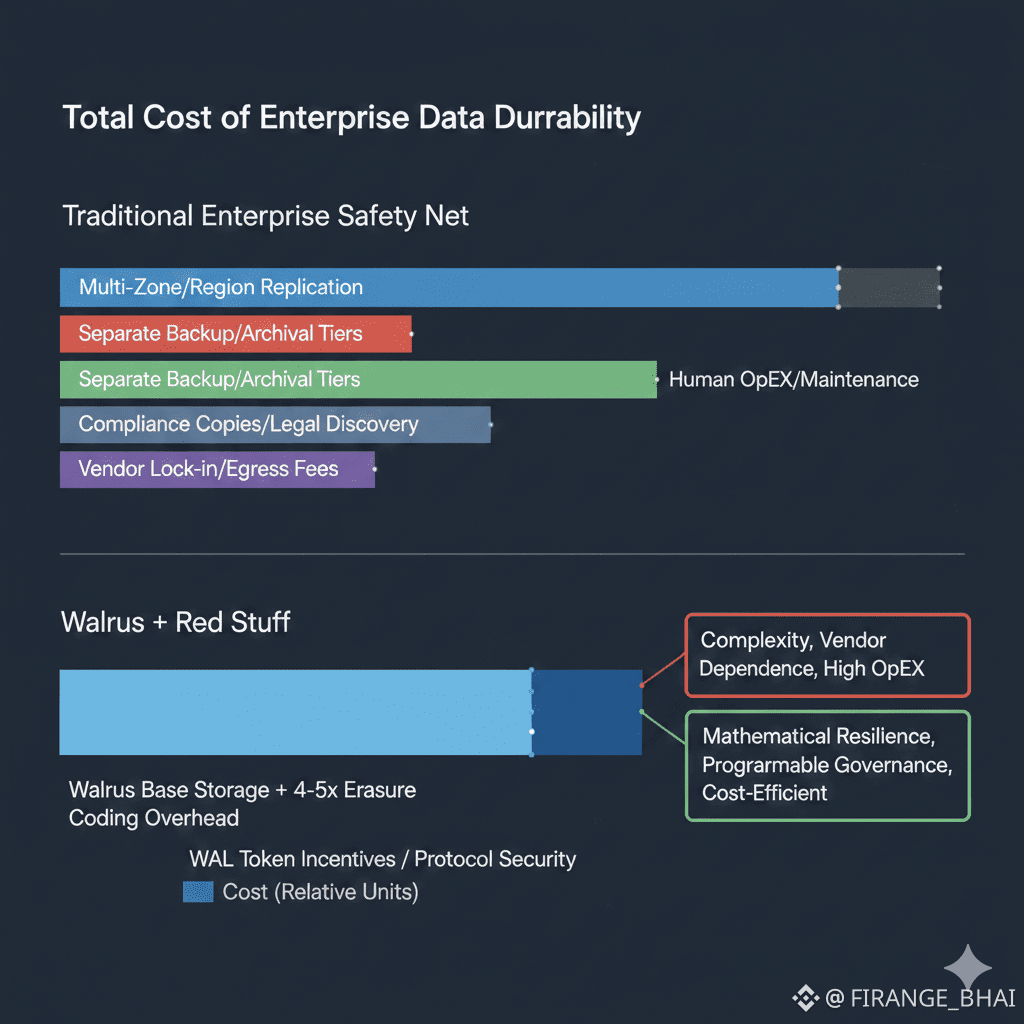 That recovery property is where Walrus becomes legible to enterprise architects. The common enterprise question isn’t “is this decentralized,” but “what happens at 3 a.m. when something breaks?” Walrus’s research claims that Red Stuff enables self-healing without centralized coordination, and that resilience can be achieved with an overhead on the order of a few multiples of the original data, rather than the much higher costs that come from simple replication. In practice, Walrus documents and related technical materials describe overhead around the four-to-five-times range for storing blobs with robustness, which is dramatic precisely because decentralized storage has historically paid for durability with brute force. Five times sounds expensive until you remember what enterprises already do when they take durability seriously: multi-zone replication, cross-region redundancy, separate backup tiers, separate archival vendors, and a growing maze of compliance copies. The real comparison is not “Walrus versus one S3 bucket.” The real comparison is “Walrus versus the total cost of the enterprise safety net,” including the cost of human work required to maintain it.