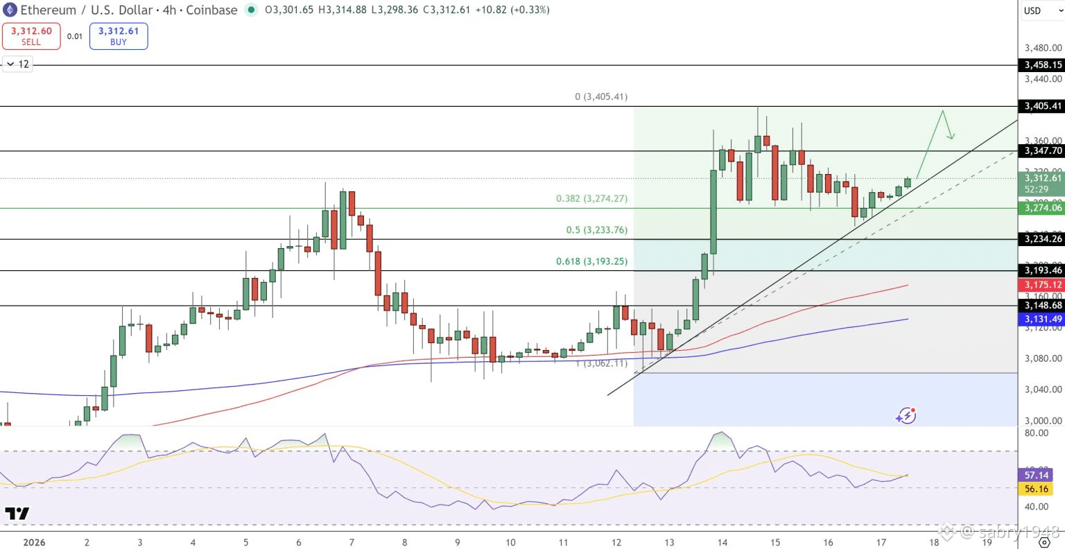 في وقت النشر (17 يناير 2026)، يبلغ سعر ETH حوالي 3324.52 دولار، بارتفاع نسبته 1.33%. يظهر السعر إمكانية اختراق نحو 3405 دولار، مدعوماً بزخم فني إيجابي.