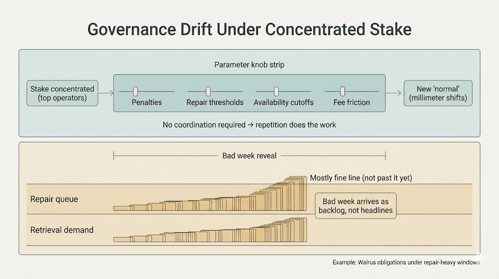 Walrus to zabezpieczona tokenami przestrzeń do przechowywania. Różna ekspozycja. Jeśli zarządzanie stanie się leniwe, pierwszą rzeczą, która umyka, nie jest "łańcuch." To dyscyplina wokół zobowiązań. Kary nieco łagodnieją. Udział nadal wygląda dobrze. Wiarygodność staje się "głównie w porządku." Potem trafiasz na zły tydzień i "głównie" przestaje być pocieszającym słowem.