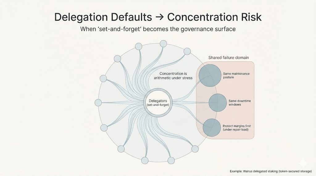 Jeśli zbyt wiele delegowanego staku gromadzi się wokół małego zestawu operatorów, Walrus nie staje się po prostu "mniej zdecentralizowany" w sensie wibracji. Zaczyna dziedziczyć ich domenę awarii... tę samą postawę konserwacyjną, te same planowane okna przestojów, tę samą instynktowną ochronę marż w pierwszej kolejności, gdy ruch naprawczy wzrasta.