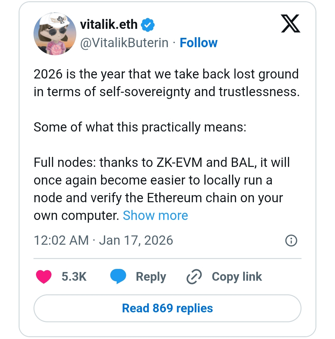 W poście na X Buterin opisał 2026 rok jako „rok odzyskiwania utraconego gruntu”, szczególnie w obszarach, gdzie użyteczność i decentralizacja były wcześniej kompromitowane w dążeniu do masowej adopcji.
