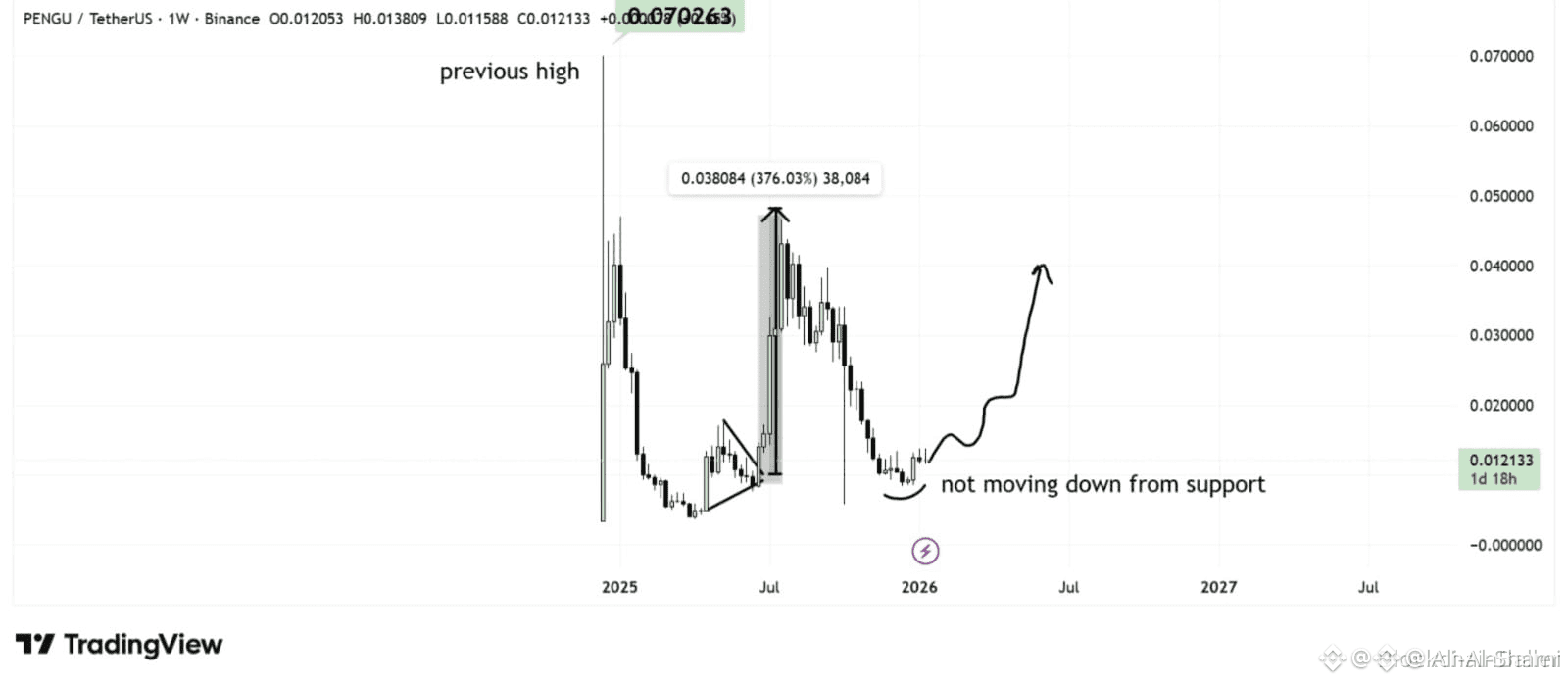 #PENGU السعر قد أكمل بالفعل دورة كاملة من التوسع الحاد، التصحيح العميق، والآن لا يتحرك للأسفل من الدعم، وهو بالضبط ما يبدو عليه القوة....