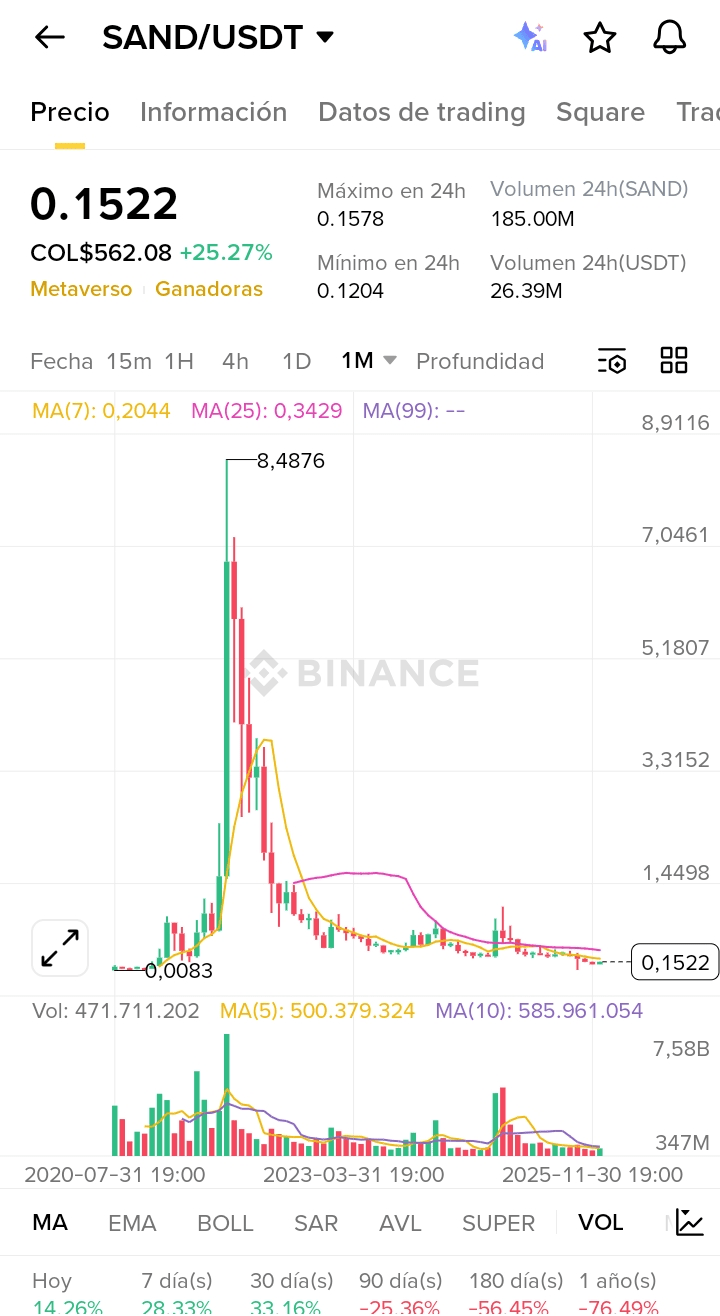 - Wolumen: Wysoki przy 181.63M SAND (25.88M USDT w 24h), wspierający rally. Wolumen w zielonych słupkach dominuje, pokazując silne zakupy.