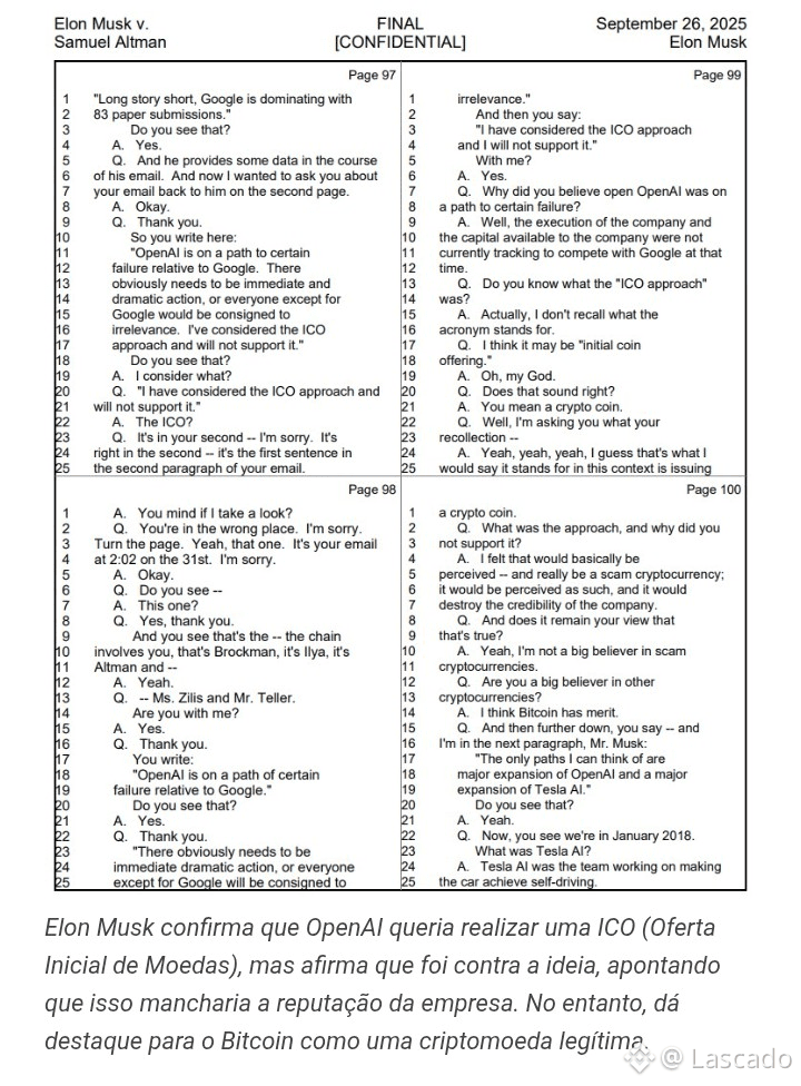 Nos papel do processo, que saíram na sexta-feira (16), o bilionário até fala de Bitcoin e dessas tais criptomoedas. Ele conta que a OpenAI chegou a pensar em fazer uma ICO — Oferta Inicial de Moedas — mas ele não gostou da conversa não. Pra Musk, esse trem ia virar uma moeda fajuta e acabar com a credibilidade da empresa.